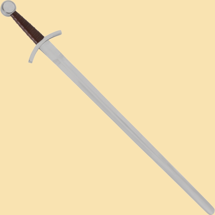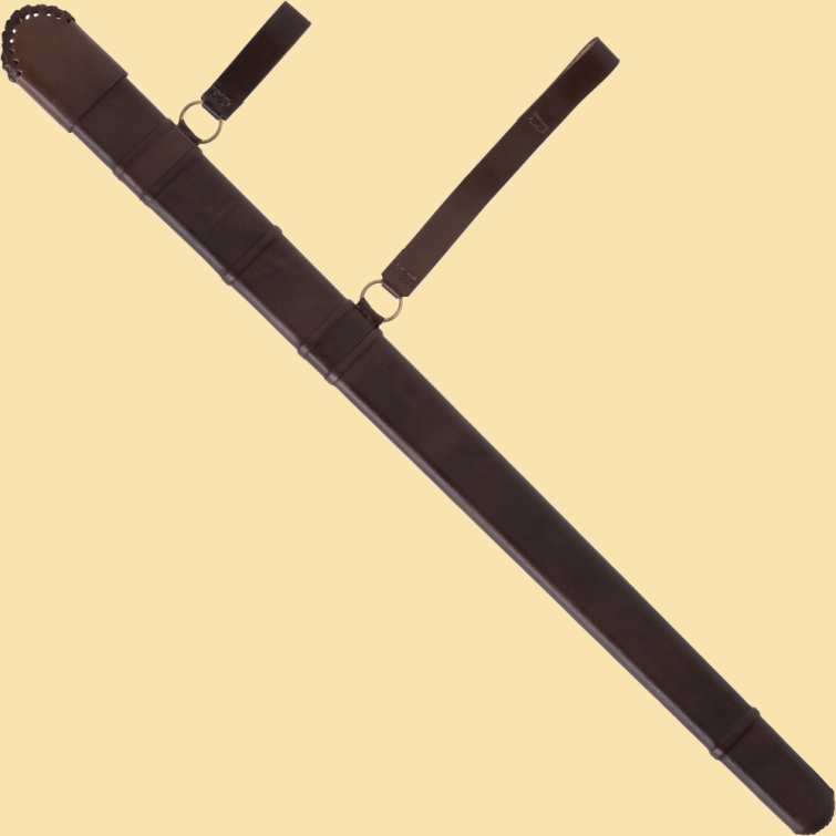Die Holzscheide ist mit Leder überzogen und hat Trageschlaufen.