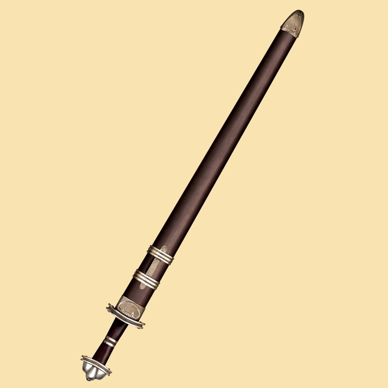 Geliefert wird das Schwert in einer Scheide aus Holz und Leder mit Gürtelschlaufe.