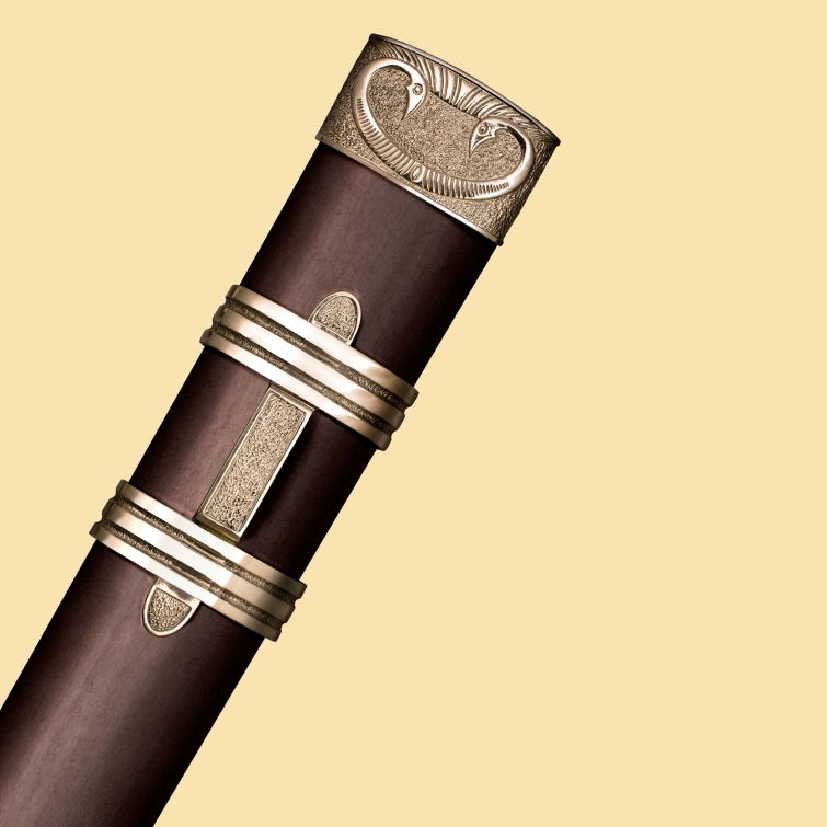 Mundblech und Ortband sind aus Messing gefertigt und mit Prägungen verziert.