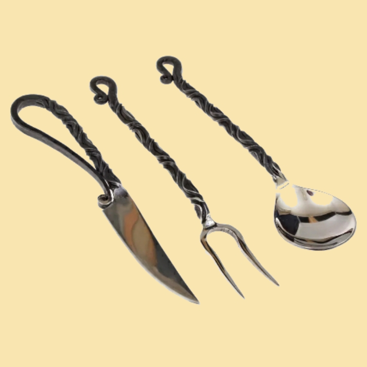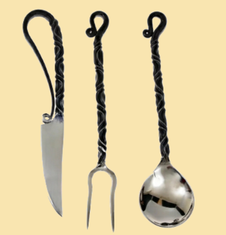 Mittelalterbesteck mit geschwärzter Tordierung als Set.