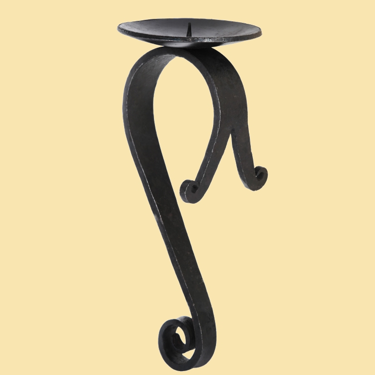 Der Kerzenständer hat eine aufgenietete, runde Tropfscheibe,