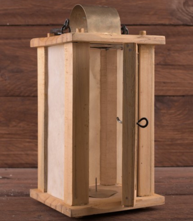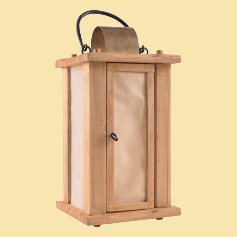 Rustikale Holzlampe mit Fenstern aus Rohhaut.
