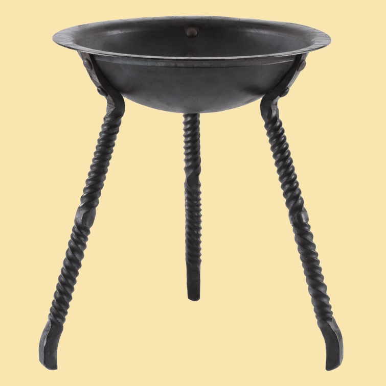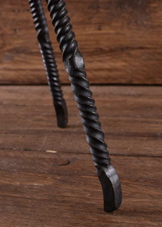 Die drei Beine aus Stahl sind von Hand freiformgeschmiedet, doppelt tordiert und fest mit der Schale vernietet.