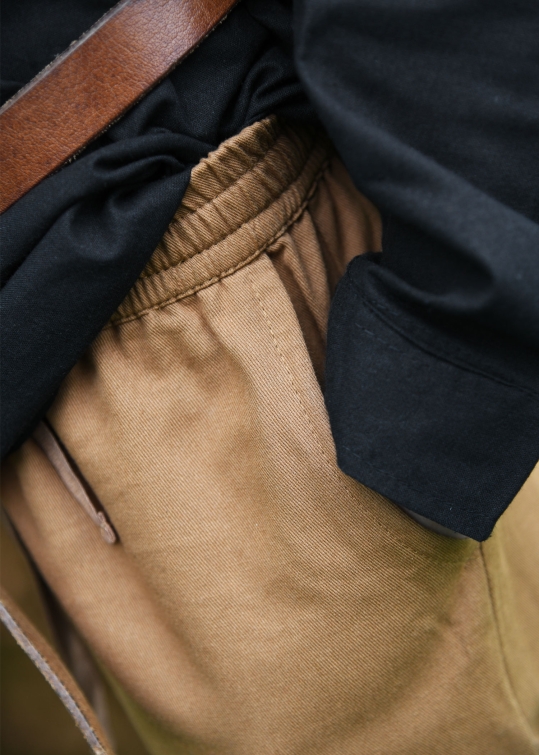 Der angesetzte Taillenbund ist mit einem Tunnelzug versehen und kann individuell angepasst werden.