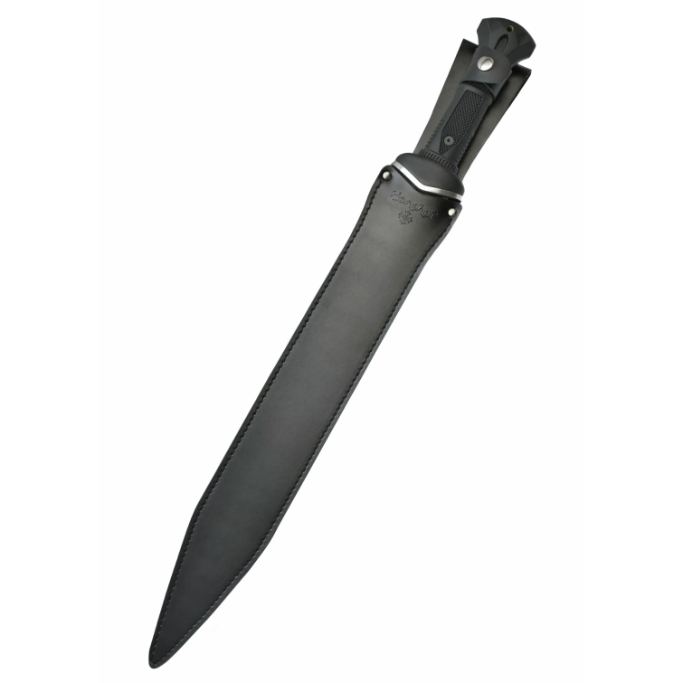 Das insgesamt ca. 64 cm lange Schwert lässt sich in einer schwarzen Lederscheide mit Schnappverschluss aufbewahren.