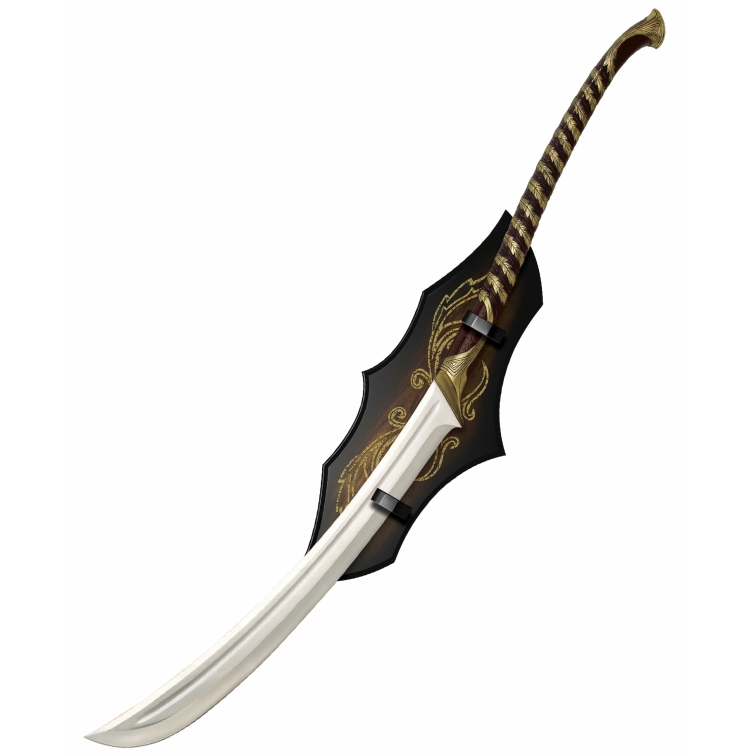 Mit einer Gesamtlänge von ca. 126 cm verfügt das elegante Schwert über eine ca. 61 cm lange Klinge aus gehärtetem 420er rostfreiem Stahl. Der Griff aus Gussmetall ist mit Lederimitat umwickelt und mit vermessingten elbischen Rankenmotiven verziert. Ein dekorativer Wandschild mit Siebdruck-Design und ein Echtheitszertifikat sind im Lieferumfang enthalten.