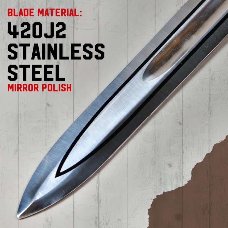 Die Edelstahlklinge hat eine Spiegelpolitur und ist mit Wikinger-Runen geätzt,
