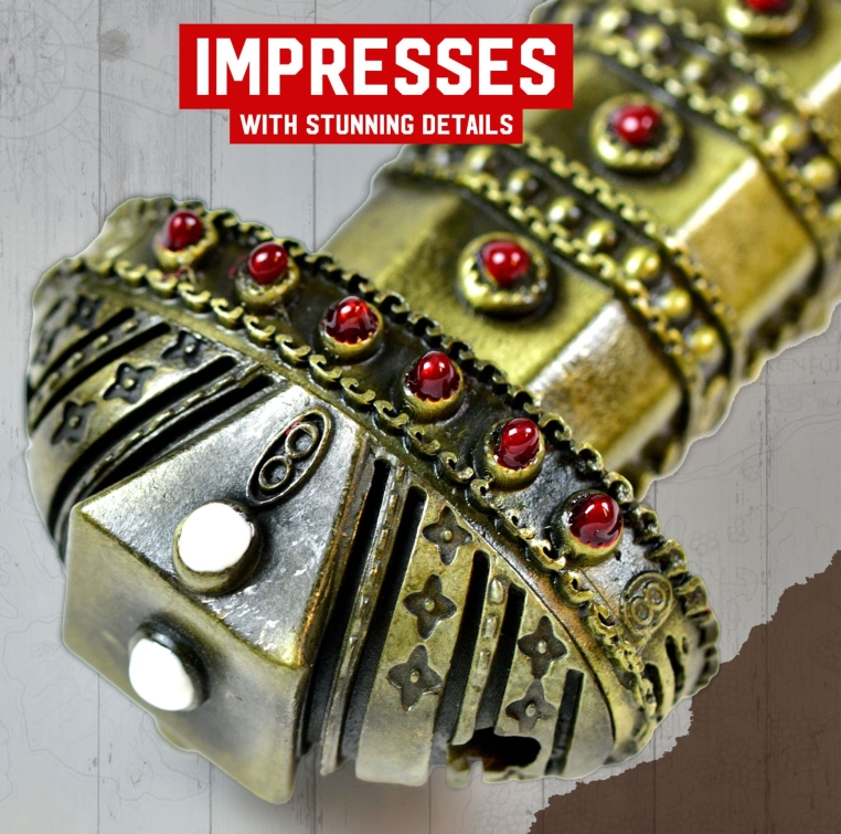 Der Griff ist mit wertvollen Edelsteinen verziert und auf der Klinge,