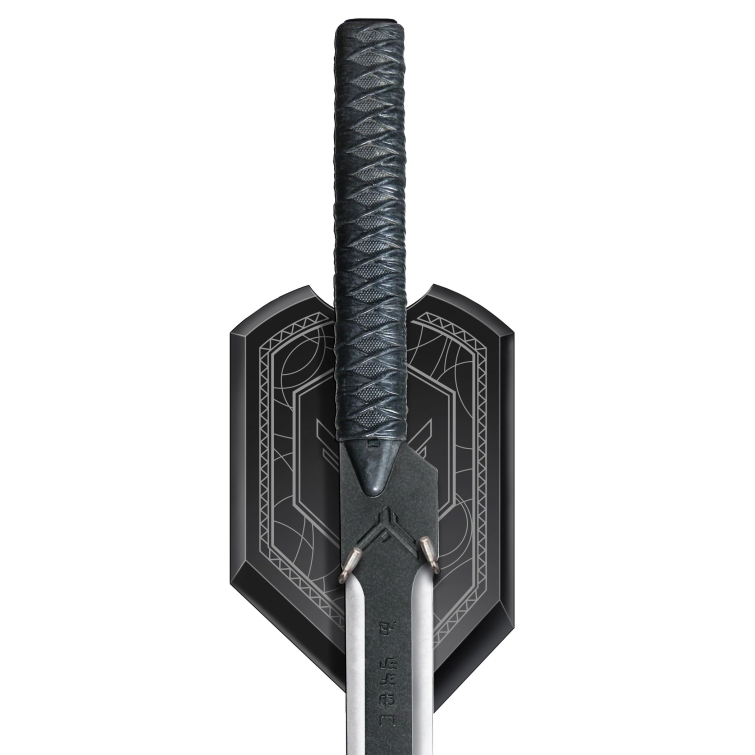 Dieses authentische und detailgetreue Sammlerstück ist eine offiziell lizensierte Replik des originalen Filmrequisits aus Dune. United Cutlery, Branchenführer im Herstellen von Film-Reproduktionen, hat das Originalschwert akribisch genau und mit den besten und hochwertigsten Materialien nachgebaut. Oberste Priorität lag dabei auf der exakten Nachbildung aller Details. Die ca. 56,8 cm lange Klinge aus rostfreiem Stahl 3Cr13 ist ca. 4 mm dick und mit einer halbglänzenden schwarzen Beschichtung versehen. Auf der Klinge sind die kaladanischen Buchstaben TVWYZ eingraviert, ein Akronym für „Triumph of Valor and Will as Your Zenith“. Um das Long Blade Schwert möglichst originalgetreu nachzubilden, ist der Griff aus spritzgegossenem Nylon mit schwarzem Lederimitat umwickelt. Direkt über dem Griff ist zudem das Falken-Siegel des Hauses Atreides eingeprägt.
