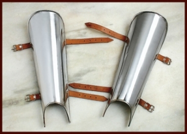 Diese Beinschienen (auch Beinröhren) sind aus 2,0 mm starkem Stahlblech handgetrieben.