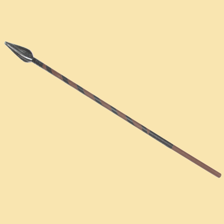 Die Spitze des Speers ist kunstvoll in Schwarz und Silber gestaltet,