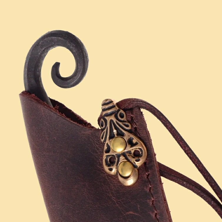 Das Druiden-Messer kommt zusammen mit einer braunen Lederscheide,