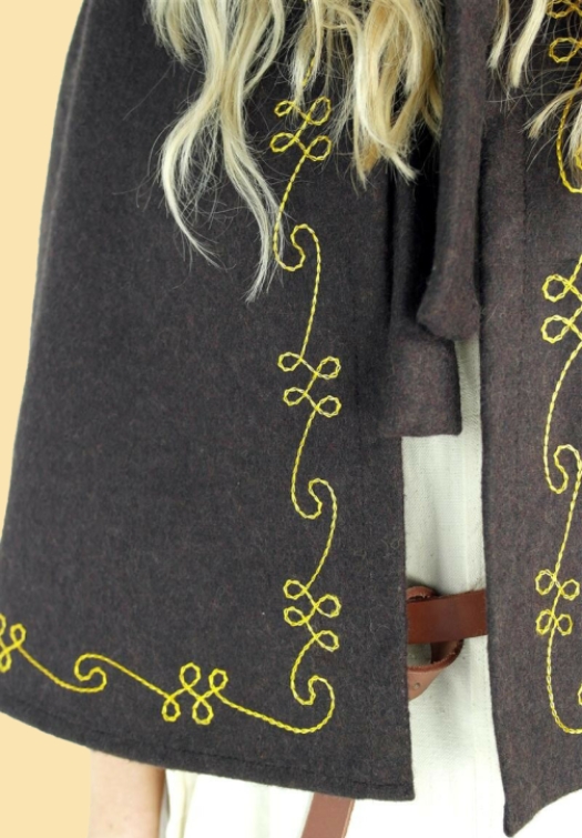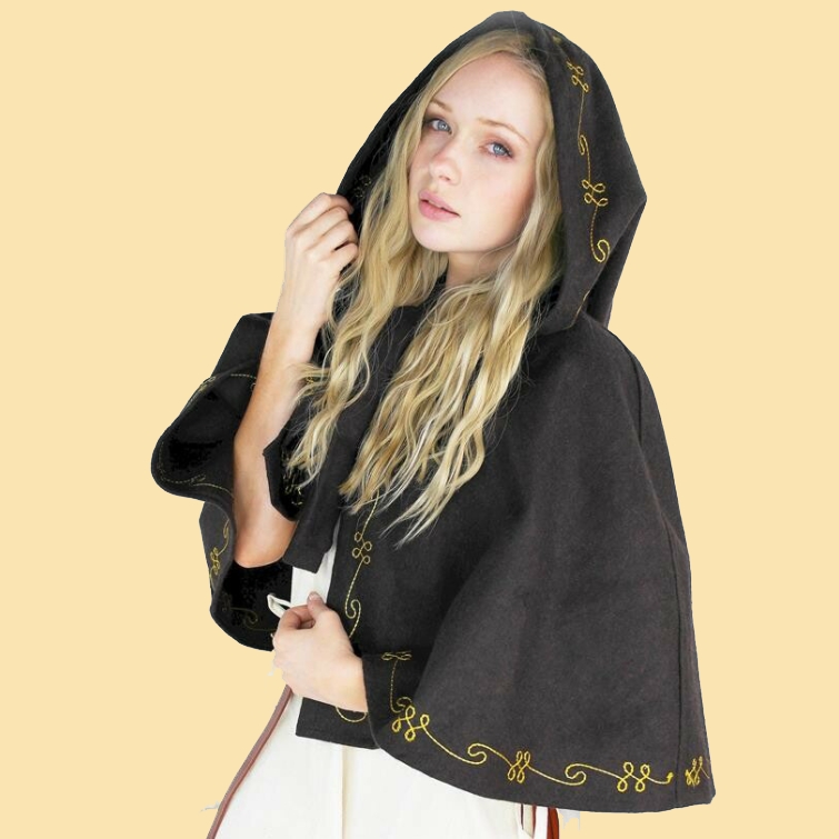 Die lange Kapuze kann an der Vorderseite gebunden werden,