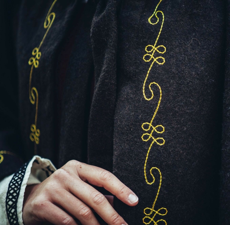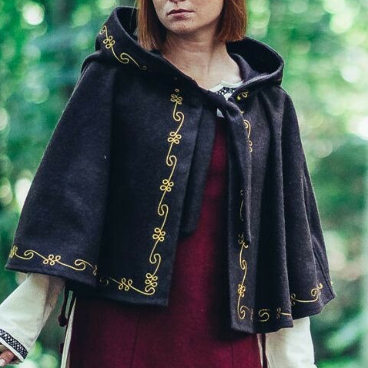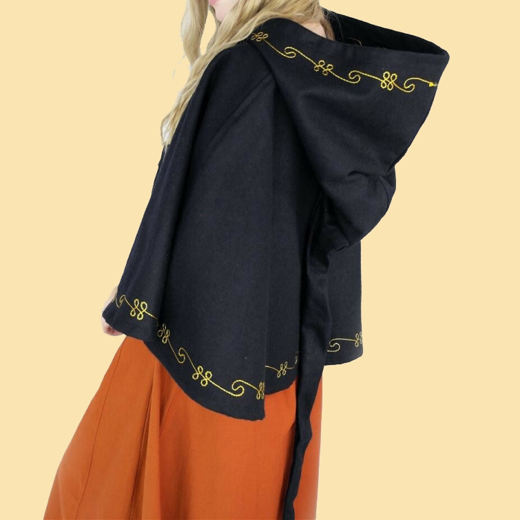 Die lange Kapuze kann an der Vorderseite gebunden werden,