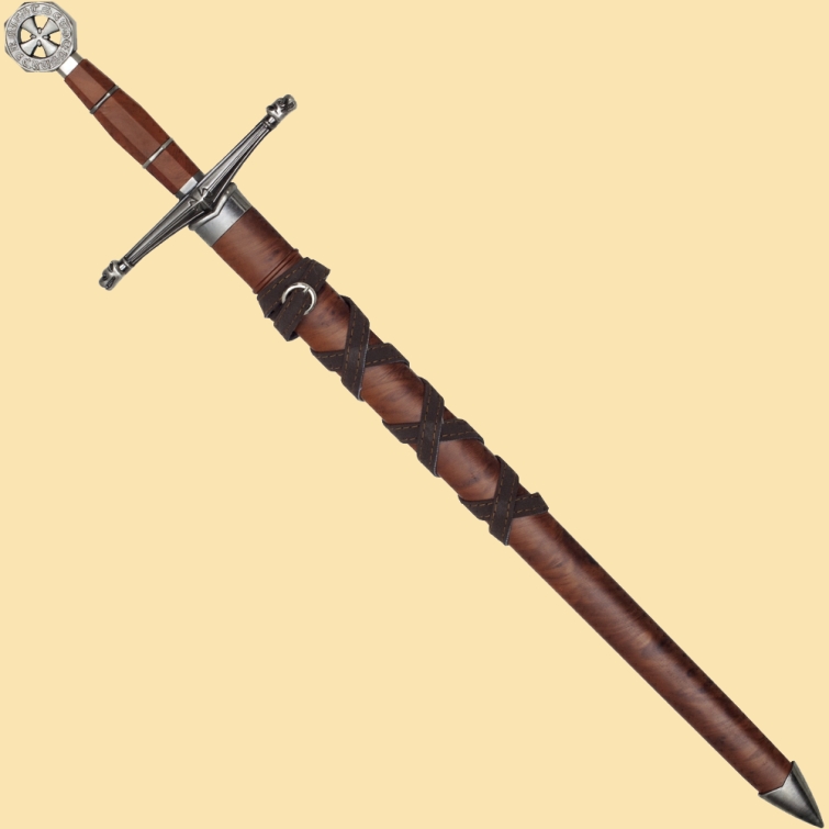 Einfacher Dolch mit Scheide, auf welcher eine dekorative Lederwicklung angebracht ist.