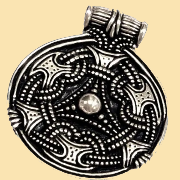 Die Replik von einem scheibenförmigen Anhänger der Wikingerzeit