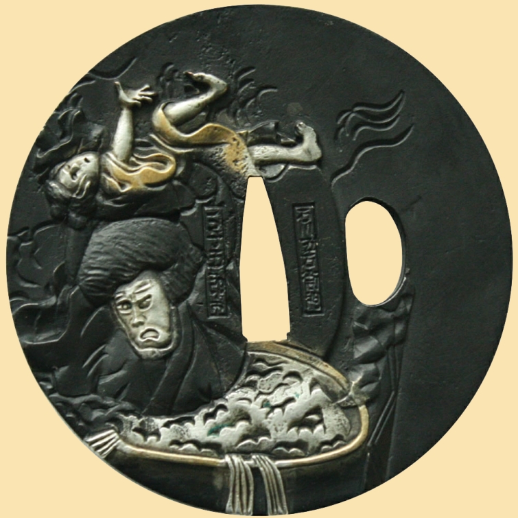 Handbemalte Tsuba mit klassischen Holzschnitt-Motiven.