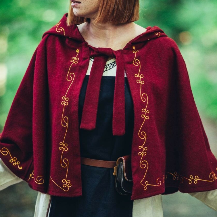 Die lange Kapuze kann an der Vorderseite gebunden werden,