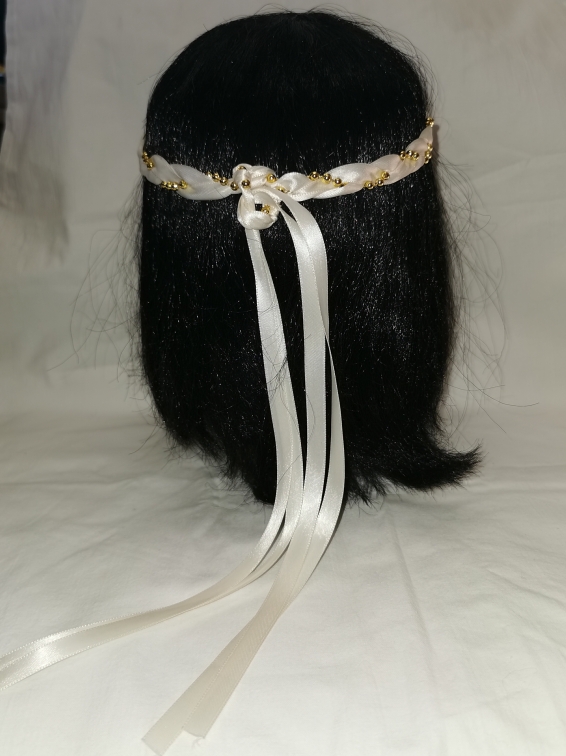 Aus Bändern geflochtener Kopfschmuck für die Dame.