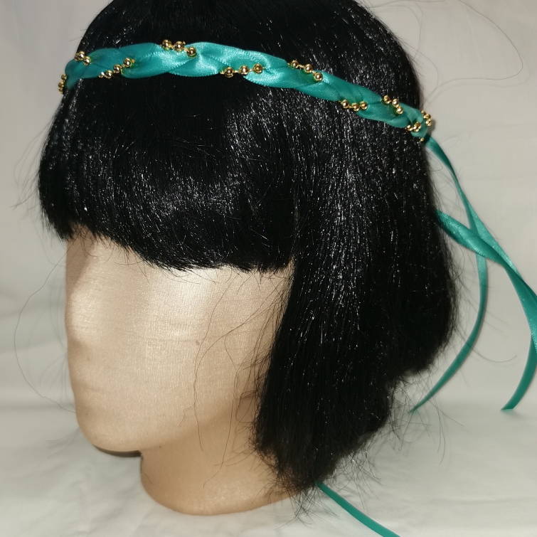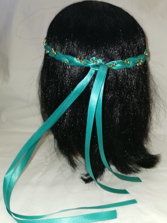 Aus Bändern geflochtener Kopfschmuck für die Dame.
