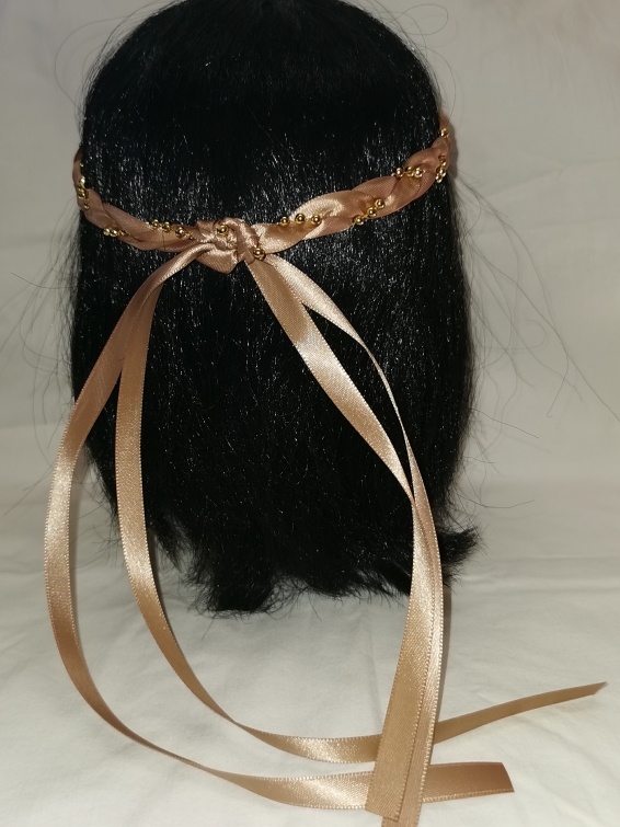 Aus Bändern geflochtener Kopfschmuck für die Dame.