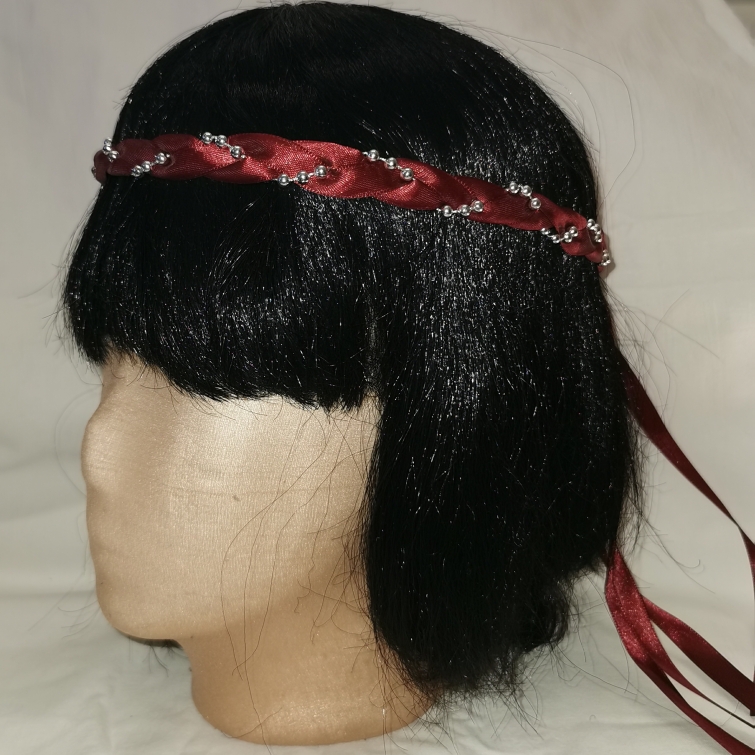 Aus Bändern geflochtener Kopfschmuck für die Dame.