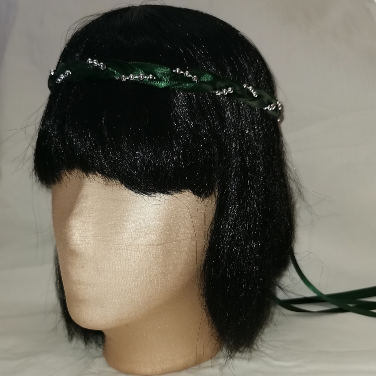 Aus Bändern geflochtener Kopfschmuck für die Dame.