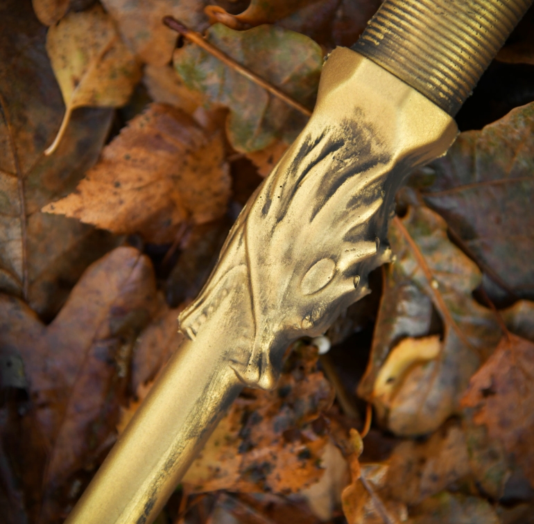während der Schaft von einem kunstvoll gearbeiteten Drachenkopf eingefasst wird –