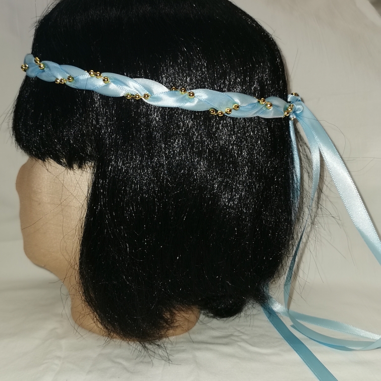 Aus Bändern geflochtener Kopfschmuck für die Dame.