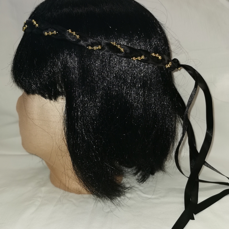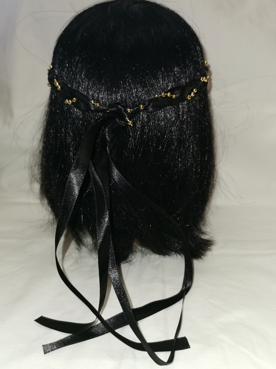 Aus Bändern geflochtener Kopfschmuck für die Dame.