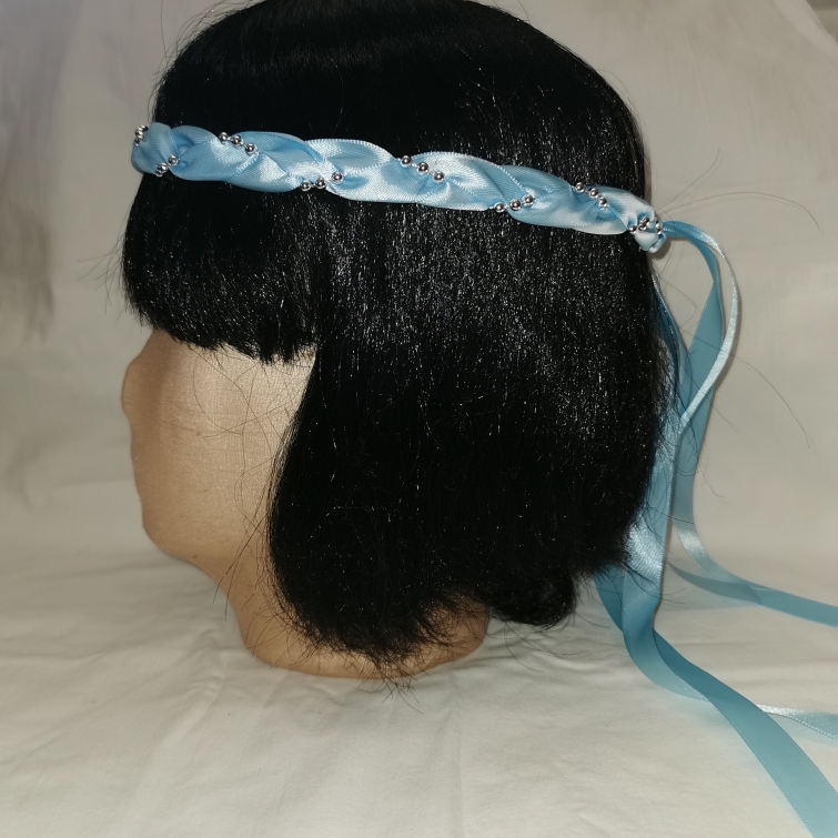 Aus Bändern geflochtener Kopfschmuck für die Dame.