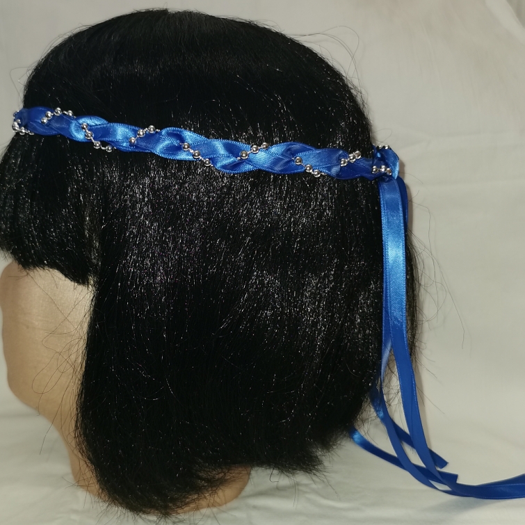 Aus Bändern geflochtener Kopfschmuck für die Dame.