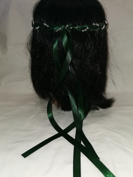 Aus Bändern geflochtener Kopfschmuck für die Dame.