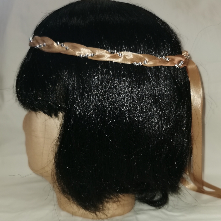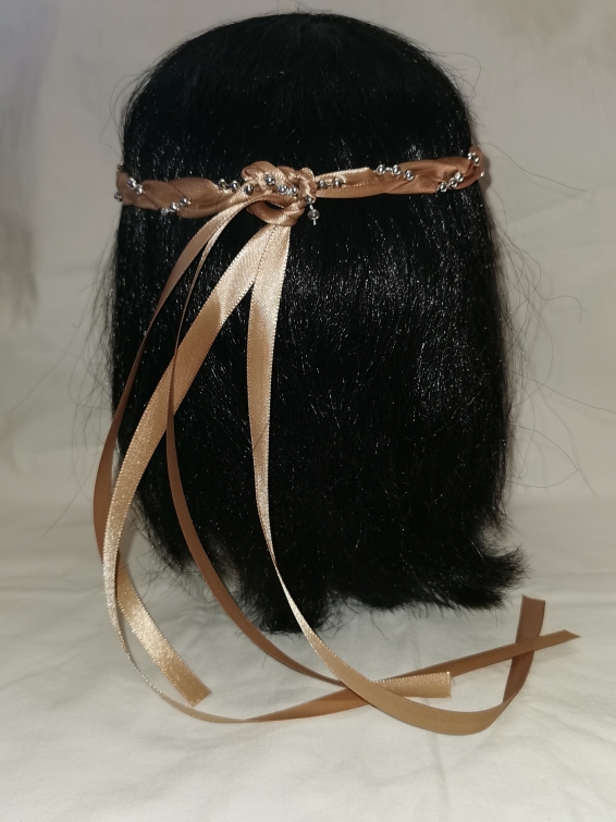 Aus Bändern geflochtener Kopfschmuck für die Dame.